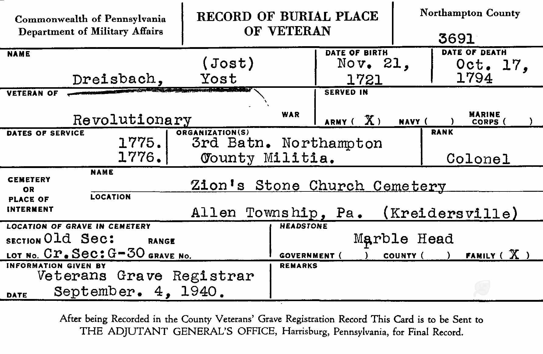 Jost Dreisbach was born Nov. 21, 1721, and died October 17, 1794. He was a member of the County Committee of Observation in 1774, captain of a company from Lehigh township in 1775, and colonel of the Third Battalion of the county in 1776.