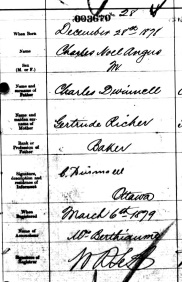 Joseph Saul Angus Dwinnell was born on December. 22, 1878. He was baptized on at Notra Dame in Ottawa. His Godparents were Charles and Delphine Ferdinand. I'm not sure he was Charles' twin or the name was written incorrectly.