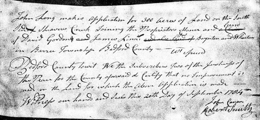 On November 2, 1784 the Long family had their land surveyed in Bedford County. John Long applied for a warrant for 300 acres on the south side of Shaver's Creek adjoining Shaver's Creek Manor and David Gordon and James Linn. In 1788 John Long was listed as a single freeman in Barree Township. In 1788 another tax assesment list was made for Barree. At that time it was in Huntingdon County. Some of the residents also appeared on the Logan and West tax list. John Long was listed as a single man. In 1788, John Little was captain of the militia in Huntingdon County. His company was made up of men from Barree including John Long. In 1790 there there were 2 John Long households in Huntingdon County. One household had 5 females and 1 male over 16 the other had 2 men over 16, 1 boy under 16 and 6 females. In 1791 Arthur Bell was captain of the second company of the first battalion from Huntingdon Township. John Long was on the muster list.
