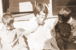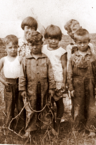 Taylor Ranch 1938. By the ice house. Dorish holding Ruth Taylor, Ethel behind Jimmy, Maryon by Twyla with Margie. Then Eil with John in front. Donald holding the dog.